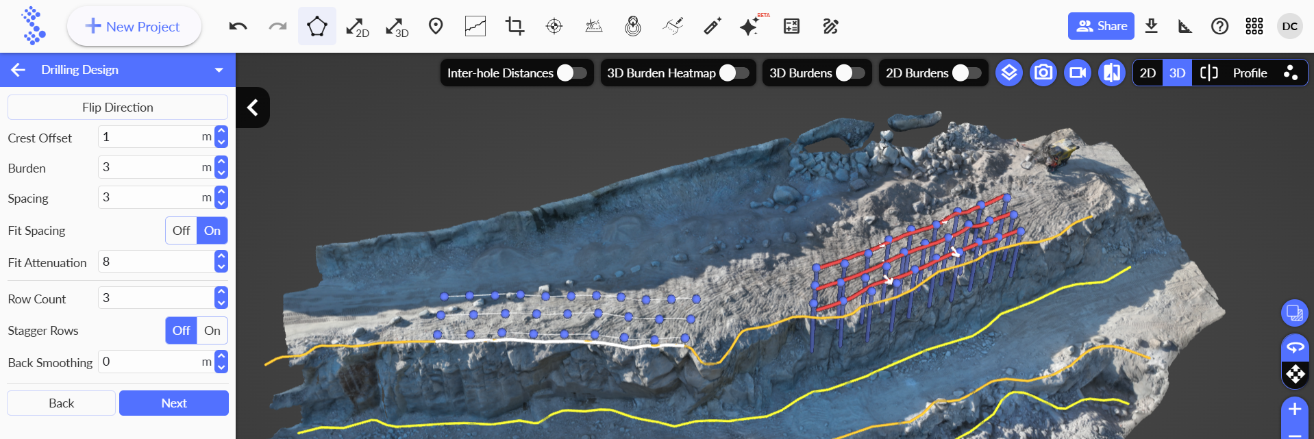 Currently, when we select a hole and open the profile mini tab, new visual indicators have been added, including blue, green, and red lines. These lines correspond to the minimum and maximum burden limits defined for the burden distance analysis. This allows us to clearly visualize how close each hole is to the specified burden thresholds directly within the profile.