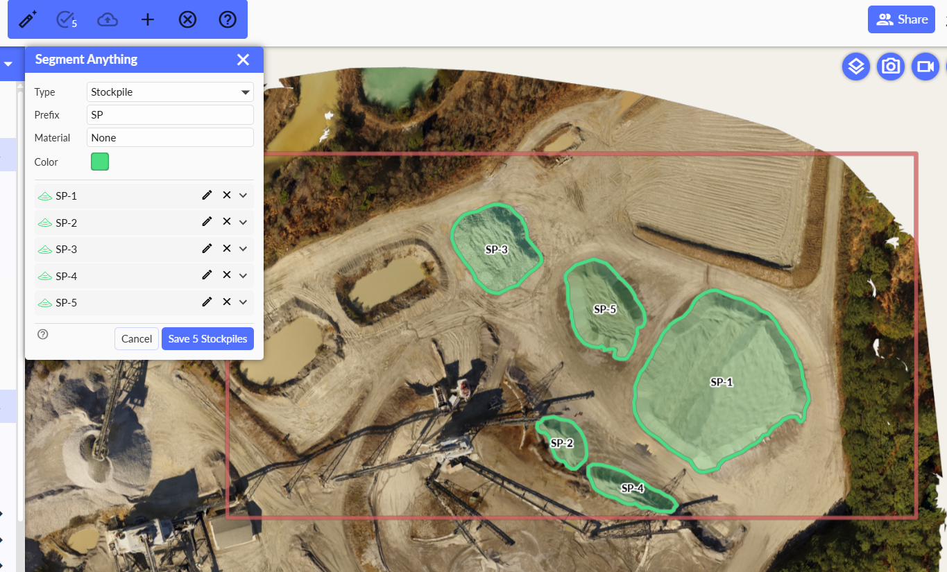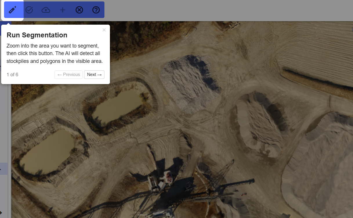 - SAI (Segmentation AI) - Strayos has introduced a new segmentation AI tool for auto detecting stockpiles and other terrain features as measurement polygons. This tool has been released in its beta phase, and can be found in the toolbar (pictured below). To utilize this tool, read more in the article here.
