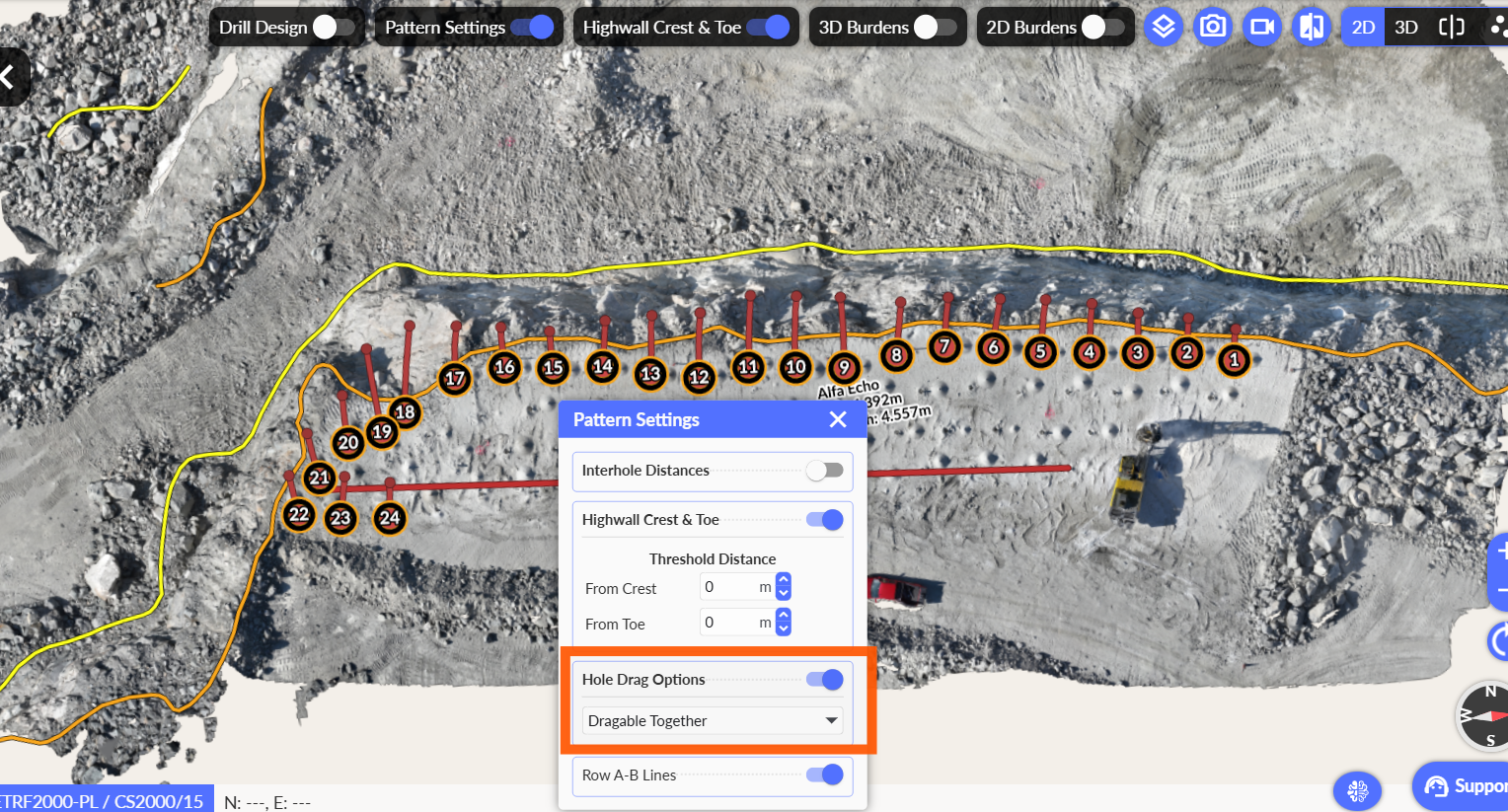 After uploading Boretrack data in the pattern options, users can choose to either drag the holes or lock them in place.