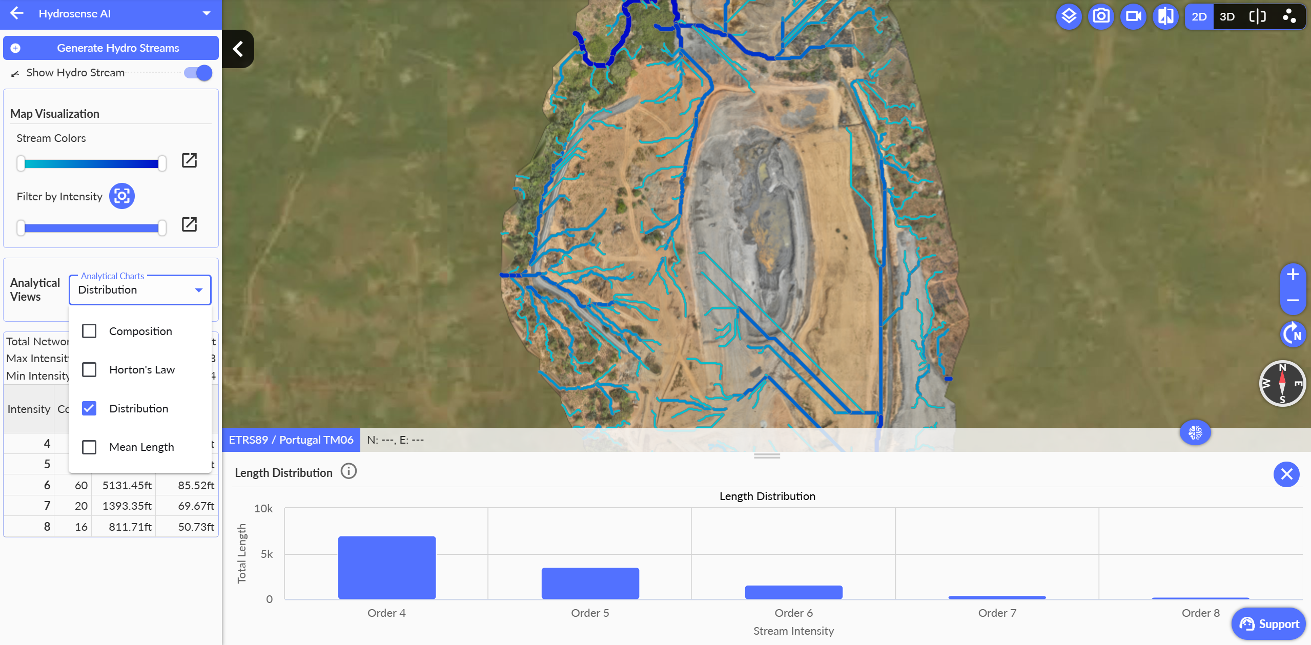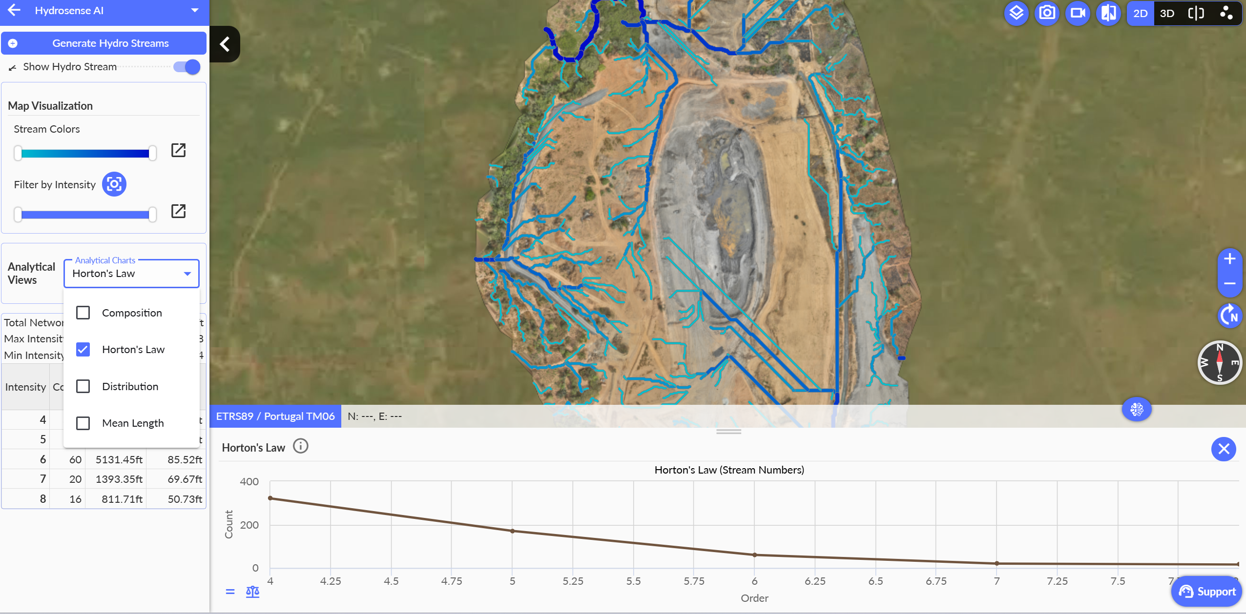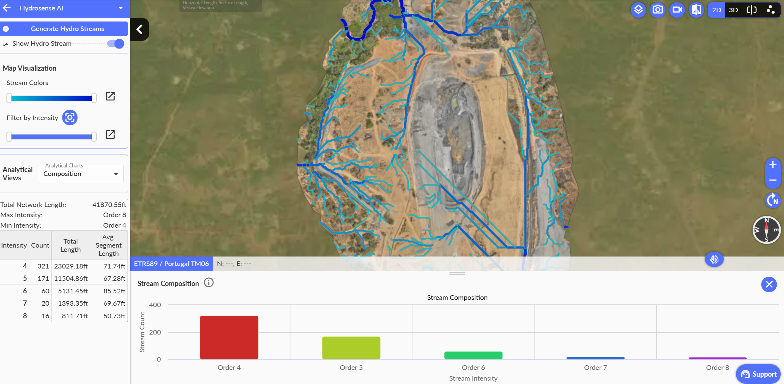 Hydro Streams in Strayos uses geospatial analysis of terrain models such as DSM and DTM to simulate how water flows across a site. It identifies drainage paths and organizes them into a hierarchical network, where stream order increases as channels merge, giving a clear view of water flow patterns and complexity.