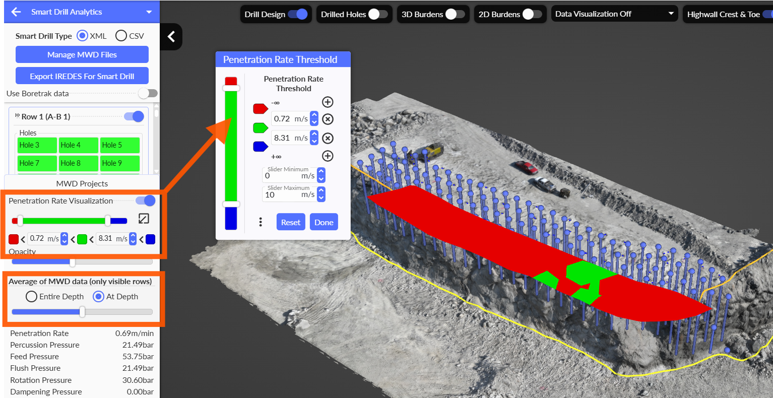 The user can choose to view the MWD information for the entire hole depth or select a specific depth to analyze. Based on this selection, a color map is generated over the blast area.