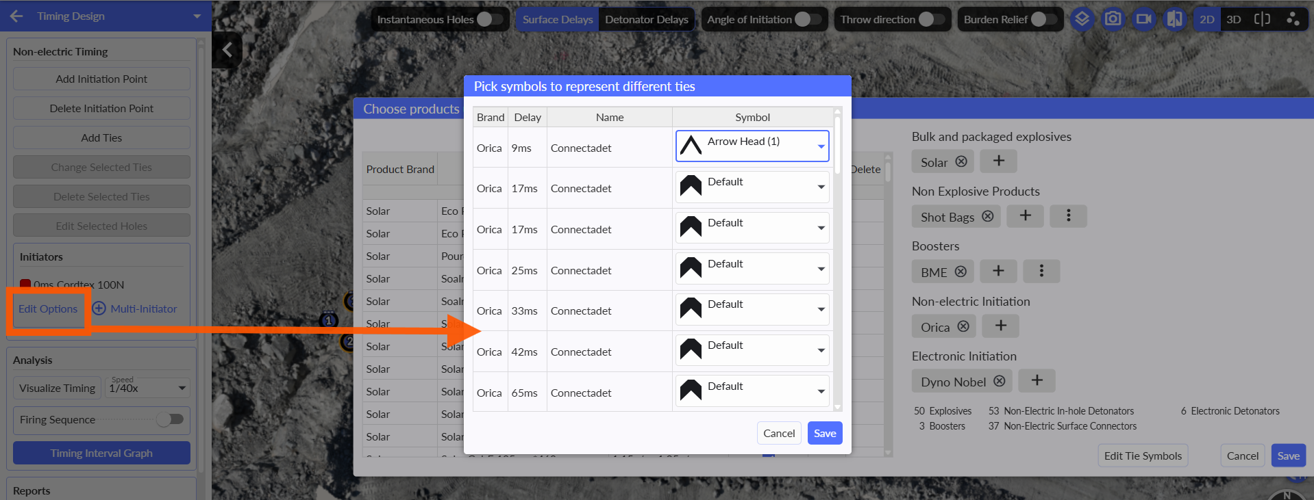 When the user selects the timing for non electric detonators, an Edit option is available for each item. Selecting Edit takes the user back to the app product page, where they can adjust how the arrows from the connection are configured and displayed according to the selected timing and brand.