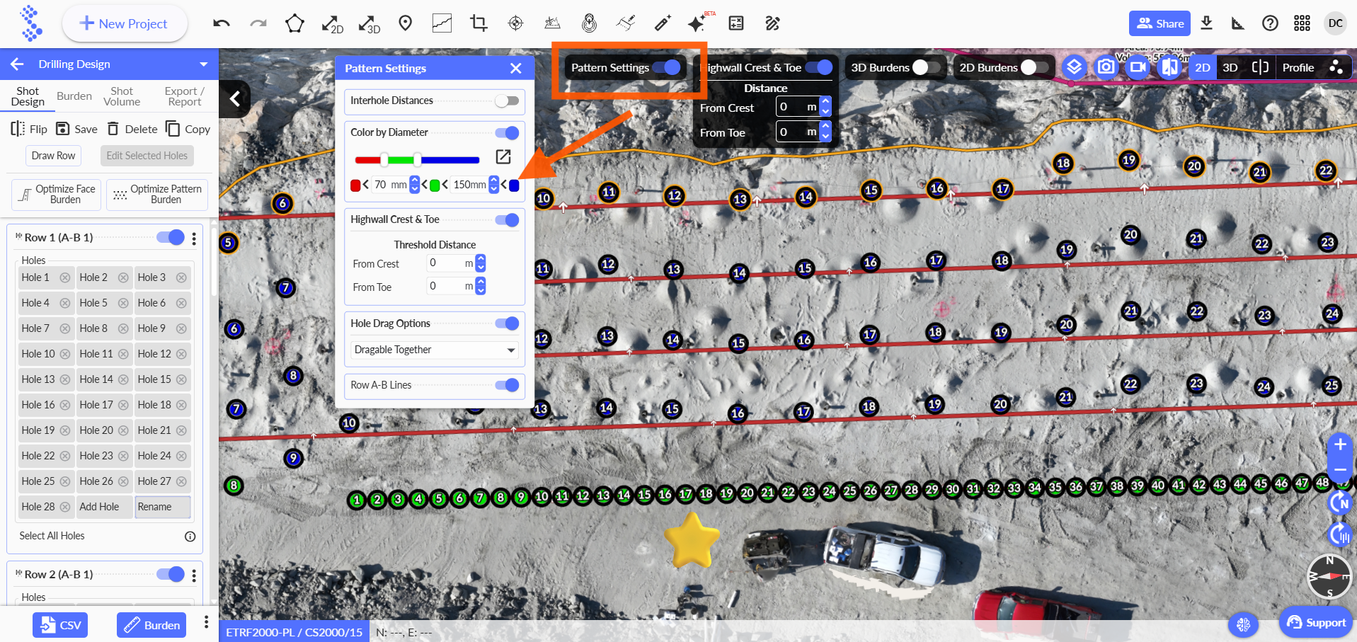 When working on the design, if the blast contains holes with different diameters, the user can go to Pattern Settings and highlight the holes according to their diameter. This allows the different hole sizes to be clearly visualized on the design.
