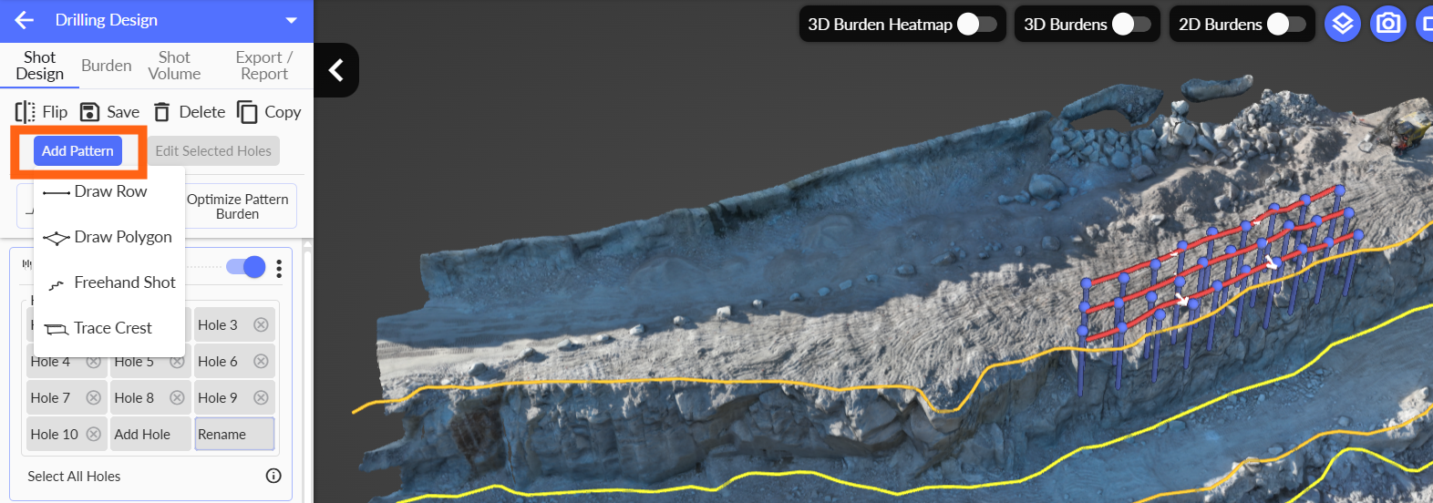 It is now possible in Strayos to design multiple blast patterns within the same project. Previously, users could only add lines to an existing blast design. With the new Add Pattern tool, you can create several independent blast designs in a single project. This is especially useful when a single bench cannot be captured in one flight and a larger area is surveyed. Users can design multiple blasts or add additional holes to an existing pattern as needed.
